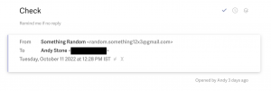 রোজেন তার টুইটারে যে বিষয়গুলো তুলে ধরেছেন তার মধ্যে একটি হলো, দ্য ওয়্যারের শেয়ার করা ছবিতে ইমেল আইডিটি অ্যান্ডি স্টোনের বর্তমান ঠিকানা নয়। যেহেতু দ্য ওয়্যার ইমেলের প্রথম অংশটি সংশোধন করেছে, রোজেন সম্ভবত ‘@fb.com’-এর কথা উল্লেখ করছিল এবং তার বক্তব্য ছিল, ইমেল আইডিগুলো এখন ‘@meta.com’-এ স্থানান্তরিত হয়েছে৷ রোজেন সতর্কতার সাথেই কথাগুলো বলেছিলেন, ইমেলের সত্যতা নিয়ে সন্দেহ প্রকাশ করতে চেয়েছিলেন কিন্তু স্পষ্টভাবে বলতে পারেননি যে স্টোনের fb.com ইমেল ঠিকানাটি বিদ্যমান নেই বা আর ব্যবহার করা হচ্ছে না।