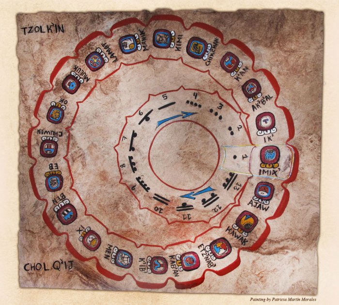 প্রি-কলোম্বিয়ান মেসোআমেরিকাতে এবং গুয়েতেমালা, ভেরাক্রুজ, অয়াক্সাকা ও মেক্সিকোর চিয়াপাসে এখনও মায়ান ক্যালেন্ডার ব্যবহার করা হয়। মায়ান ক্যালেন্ডার ব্যবহারে যে পদ্ধতি ব্যবহার করা হয় তার চল কমপক্ষে খ্রিস্টপূর্ব ৫ম শতাব্দী থেকে শুরু হয়েছিল। মায়ান ক্যালেন্ডার দুই ধরনের হয়ে থাকে; দ্য হাব বা সাধারণ ক্যালেন্ডার (৩৬৫ দিন, ১৮ মাস, মাসে ২০ দিন) এবং যোল্কিন বা পবিত্র ক্যালেন্ডার (২৬০ দিন, মাসগুলো ৩ টি ভাগে বিভক্ত, মাসে ২০ দিন)। হাব এবং যোল্কিন ক্যালেন্ডার একসাথে কাজ করে একই মেশিনের দুইটি অংশের মত। মায়ান ক্যালেন্ডারের মাসগুলোর দায়িত্ব ছিল আলাদা আলাদা দেবতাদের উপর। যেহেতু দেবতারা অমর, সেহেতু দেবতাদের কাজ ছিল তাদের নির্দিষ্ট মাসগুলোতে নিরবচ্ছিন্ন ভাবে শক্তির সঞ্চার করা।