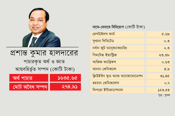দুদক কর্মকর্তাদের দেয়া তথ্য মতে, পি কে হালদার পিপলস লিজিং, ইন্টারন্যাশনাল লিজিং অ্যান্ড ফাইন্যান্সিয়াল সার্ভিসেস, পিপলস লিজিং অ্যান্ড ফাইন্যান্সিয়াল সার্ভিসেস, এফএএস ফাইন্যান্স অ্যান্ড ইনভেস্টমেন্ট লিমিটেড ও বাংলাদেশ ইন্ডাস্ট্রিয়াল ফাইন্যান্স কোম্পানির (বিআইএফসি) দায়িত্বে থেকেই প্রায় ৩ হাজার ৬০০ কোটি টাকা লুট করেছেন।