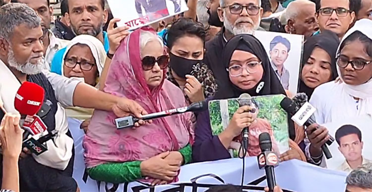 আমার ভাইয়ের খবর দিন। আমার ভাইকে ফেরত চাই। বংশাল থানা ছাত্রদলের সভাপতি পারভেজের স্ত্রী ফারজানা আক্তার বলেন, আজ ১০ বছর ধরে রাস্তায় রাস্তায় স্বামীকে খুঁজে বেড়াচ্ছি। আমার বাচ্চাকে কেন শাহবাগে গাড়ি থেকে নামতে দেয়া হয়নি।