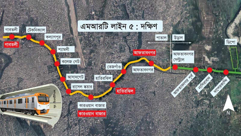পাতাল ও উড়াল মিলিয়ে মোট ১৭ দশমিক ২০ কিলোমিটার দীর্ঘ হবে এমআরটি লাইন-৫ (সাউদার্ন রুট)। এর মধ্যে রাজধানীর গাবতলী থেকে আফতাবনগর পর্যন্ত ১৩ কিলোমিটার পাতাল ও আফতাবনগর থেকে দাশেরকান্দি পর্যন্ত চার কিলোমিটার হবে উড়ালপথ। ২০২৪ সালের প্রথম দিকে কাজ শুরু হয়ে ২০৩০ সালের মধ্যে প্রকল্পটি শেষ করার পরিকল্পনা সরকারের। এ রুট নির্মাণে ব্যয় ধরা হয়েছে ৫৪ হাজার ৬১৮ কোটি টাকা। এর মধ্যে সরকারি অর্থায়ন ১৫ হাজার ৪৮০ কোটি টাকা। ৩৯ হাজার ১৩৮ কোটি টাকা নেয়া হবে প্রকল্প সহায়তা হিসেবে। এ প্রকল্পে এশীয় উন্নয়ন ব্যাংক (এডিবি) থেকে ২ দশমিক ৫ বিলিয়ন ডলার বা সাড়ে ২৭ হাজার কোটি টাকা এবং বাকি ১২ হাজার ১০০ কোটি টাকা কোরিয়ান এক্সিম ব্যাংক থেকে নেয়া হবে।