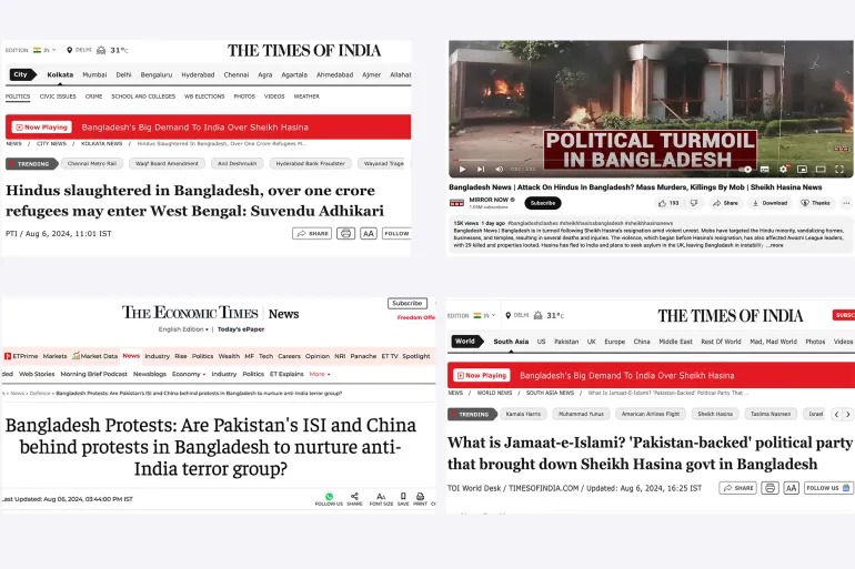 সেসব গণমাধ্যমের প্রতিবেদনে বলা হচ্ছে হাসিনার পতনে বাংলাদেশে সংখ্যালঘুদের ওপর নির্যাতন শুরু হয়েছে এবং তাতে জড়িত রয়েছে দেশটির ইসলামপন্থী দলগুলো। ভারতীয় গণমাধ্যম এবং সোশ্যাল মিডিয়া প্ল্যাটফর্ম জুড়ে বিভ্রান্তিকর বিষয়বস্তু সম্বলিত নিবন্ধ এবং ভিডিও প্রচার করা হচ্ছে।